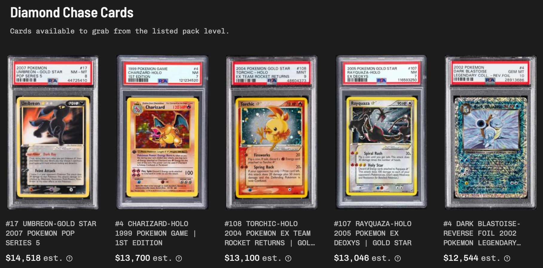 Immediate withdrawal costs about $12 per card. If you choose the option to immediately sell the card back to GameStop you will be paid 90% of market value. Their 5 available tiers include: Starter - $25, Silver - $50, Gold - $100, Platinum - $500, and Diamond - $1,000. Each tier has different average values and chase cards, with chase cards in the "Diamond" tier valuing as high as $14,000+. GameStop is very clear about the odds and chase cards of each tier, currently it shows about a 29% chance of "breaking profit" and a roughly 40% chance of a card valued below your tier's price.